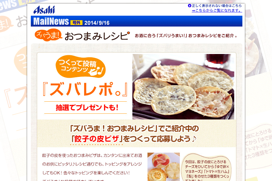新規レシピ会員掘り起こしの目的で発行した、人気コンテンツズバうま!レシピのメールマガジン。配信前の登録作業までを担当。