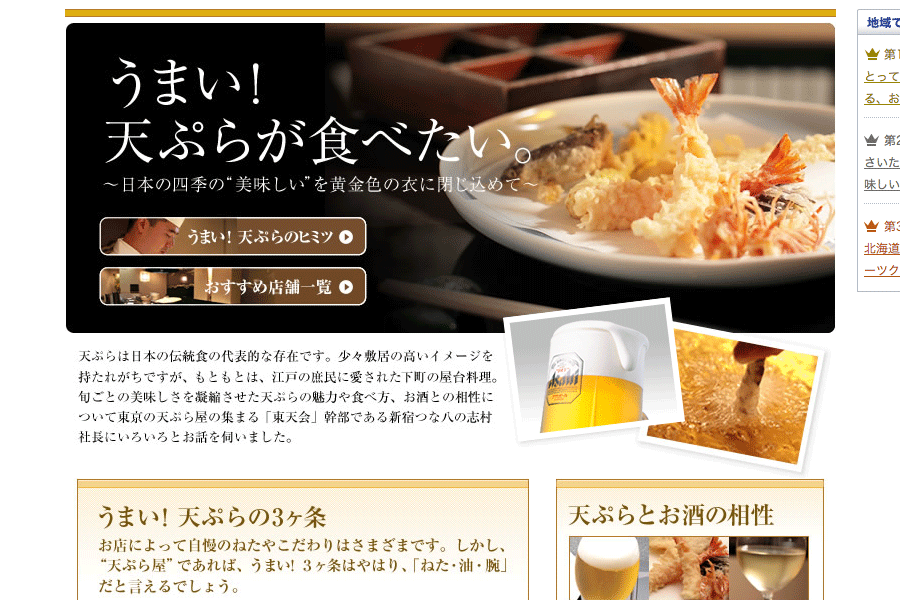 首都圏の天ぷら屋誘致と、ビールの販促を兼ねた特集ページ。
