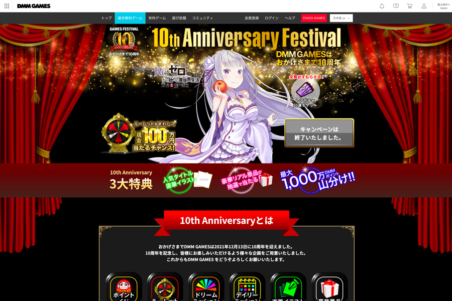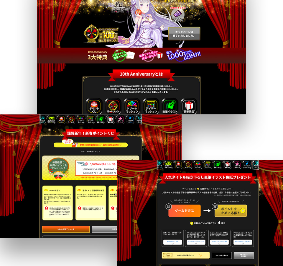 DMM GAMESの10周年コンテンツのエリアデザインを担当。ページが長いので、極力SVGやCSS装飾を考慮してデザインした。