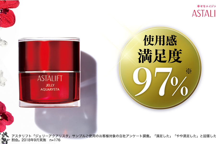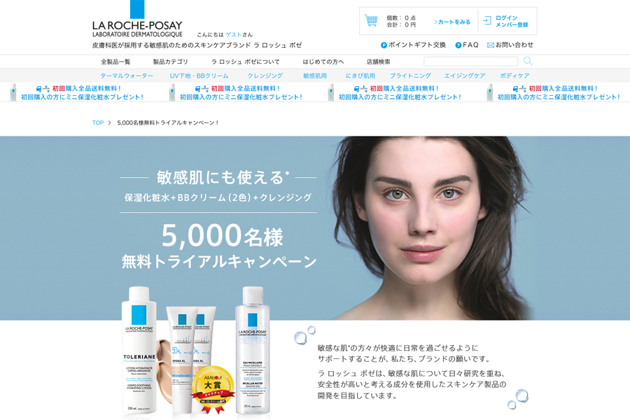 新商品のし試供品提供LP。「水」に由来する化粧品らしく、シンプルなレイアウト、シンプルな色使いを念頭にデザイン。
