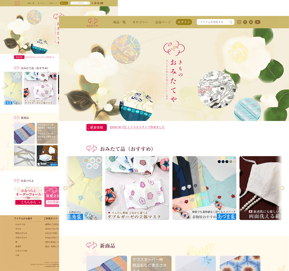 高級着物を取り扱うネットショップのトップページデザイン。着物の高級かつ、はんなりとしたイメージを花の日本画を散りばめつてショップのコンセプトを表現。 ※デザインのみ納品のため、ローンチ時期は不明。