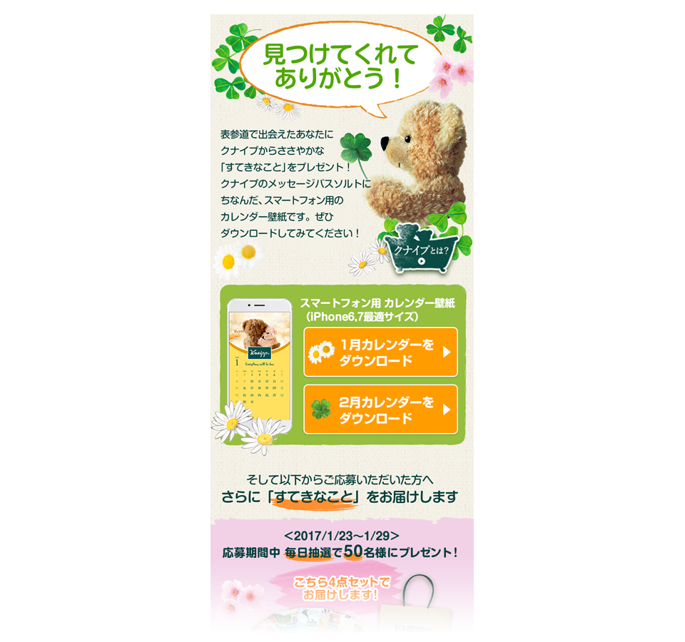 入浴料メーカー「クナイプ」が開催した街頭CPのランディングページ。トンマナに厳しいメーカーであったので、世界観を崩さないよう配慮。