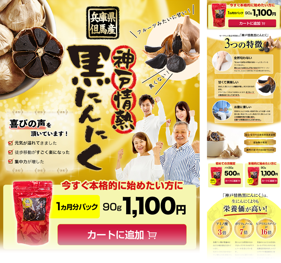 兵庫県の但馬産の黒にんにくをブランディングした健康食品黒にんにくのLP。にんにくの持つパワーと同時に安心安全の国産素材であることを盛り込んだ。 ※デザインのみ納品のため、ローンチ時期は不明。