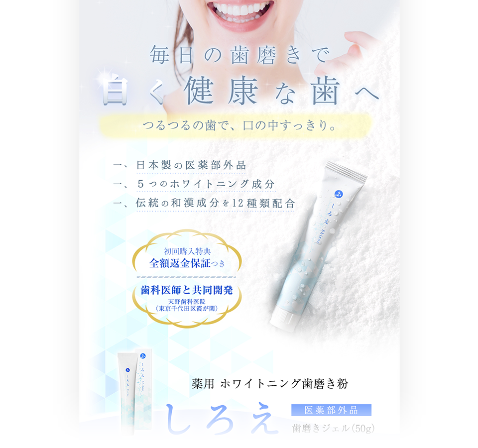 コンセプトは「自然の素材、和の素材」。歯の白さを、自然界の「白」に融合させ、「自然由来・美白」を強調して訴求するイメージ。 ※デザインのみ納品のため、ローンチ時期は不明。
