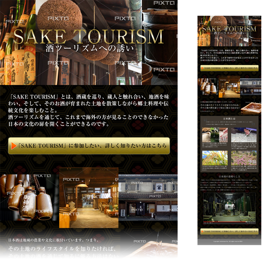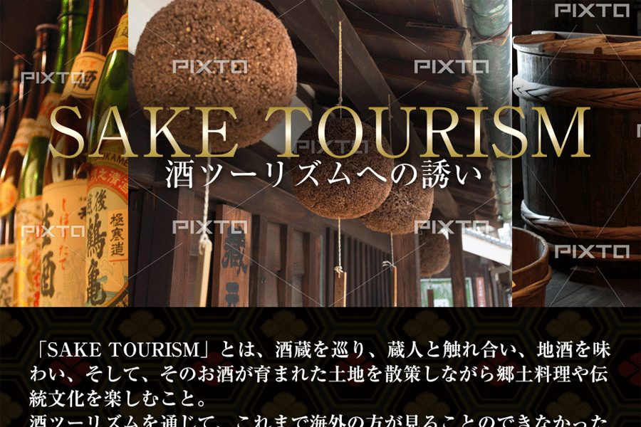 外国人旅行者向けの酒蔵を巡るツアーへの誘致目的で制作。高級感と伝統がコンセプトに、レスポンシブルを想定したデザイン。キャッチコピー等もこちらから提供。デザインのみ納品。