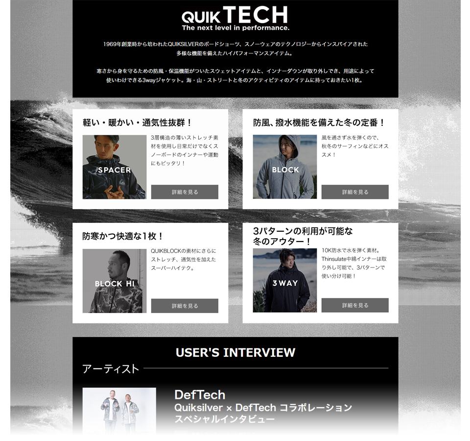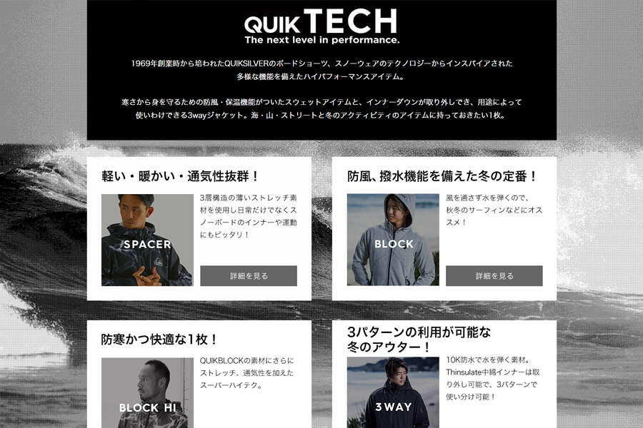 新ブランドQUIKTECHのLPデザイン。あえてモノトーンの世界にすることで、機能性に焦点を当てた骨太なアイテムであることを表現。